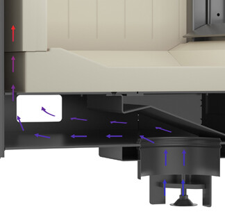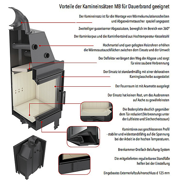 Hochmantel und quer gelegten Heizrohren erhöhen die Wärmeaustauchflächen zwischen dem Einsatz und der Umwelt.