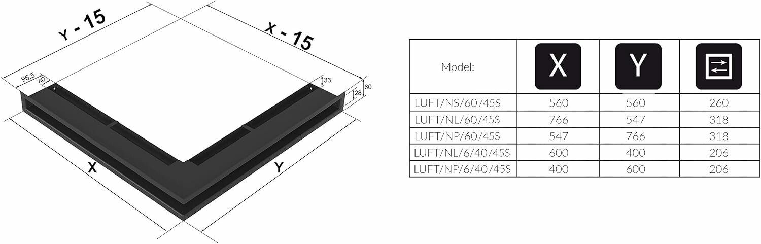 KRATKI Luft Lüftungsgitter für Kamine Rechtes Eckgitter mit abgedecktem Lufteinlass 45 Grad Pulverbeschichteter Stahl 40x60x6cm Verschiedene Farbe