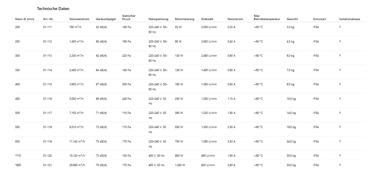 Die Geräte sind mit einphasigen Asynchronmotoren (Ø 200–630) sowie dreiphasigen Asynchronmotoren (Ø 710 und 800) ausgestattet, die auf Kugellagern gelagert sind.