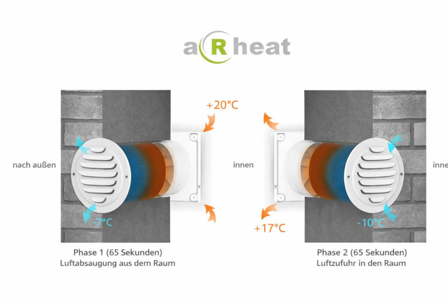 Der aRheat ist für die Wanddurchführung (Durchsteckmontage) konzipiert. Die teleskopische Bauweise des Rekuperators ermöglicht den Einbau in Wänden mit einer Stärke von 270 mm bis 500 mm. Der Ventilator wird über ein Netzkabel mit Stecker (Kabellänge 90 cm) betrieben und mittels einer programmierbaren Fernbedienung gesteuert, die mit mehreren Geräten gekoppelt werden kann.